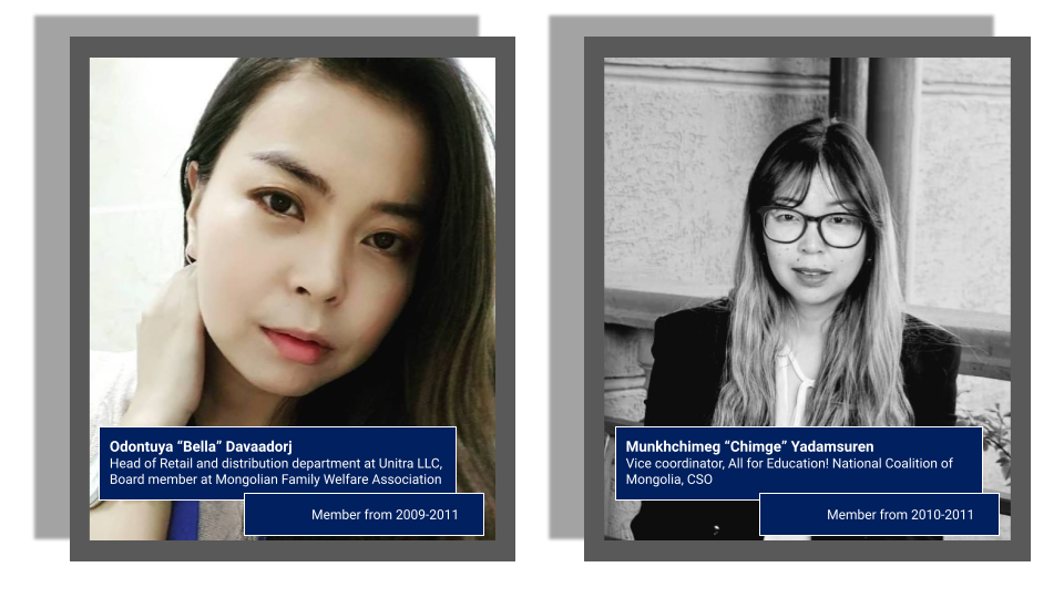 Үе үеийн YAPers Нэгдсэн Үндэсний Залуучуудын Зөвлөх Хорооны үе үеийн гишүүд United Nations Youth Advisory Panel, Alumni Wall Anujin Bayasgalan, member from 2019-2021, project manager at Youth Council NGO