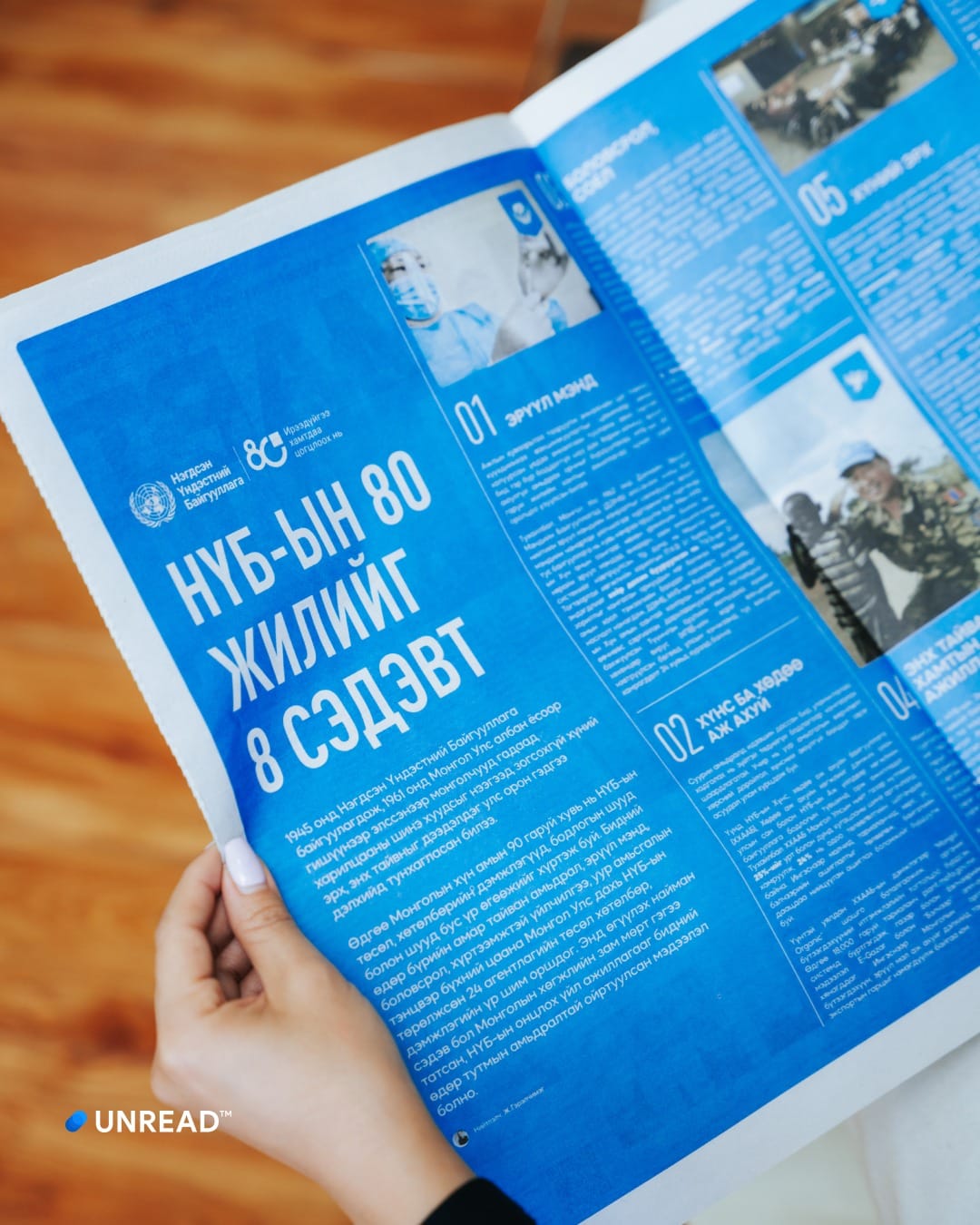 Эдгээр мэдээлэл UNREAD TODAY-ын шинэ дугаарт нийтлэгдсэн бөгөөд та бүхэн уншин НҮБ-ын Монгол Улсад хийсэн бодит ажлууд, үр нөлөө, хамтын ажиллагааны түүхэн хөгжлийн талаар илүү гүн ойлголт авах боломжтой. Өнгөрсөн 80 жилийн хугацаанд НҮБ нь хүн төрөлхтнийг дайнаас энх рүү, ядуурлаас хөгжил рүү, сорилтоос хамтын шийдлийн зүг урагшлахад үнэтэй хувь нэмэр оруулсаар ирсэн.Дэлхий даяарх энх тайван, тогтвортой хөгжил, хүний эрхийг дэмжих ахиц дэвшил нь НҮБ болон улс орнуудын олон талт хамтын ажиллагааны үр дүнд бий болсон билээ. НҮБ-ын санаачилсан бодлого, хөтөлбөрүүд бидний өдөр тутмын амьдралд үл анзаарагдам боловч чухал нөлөө үзүүлсээр байдаг.