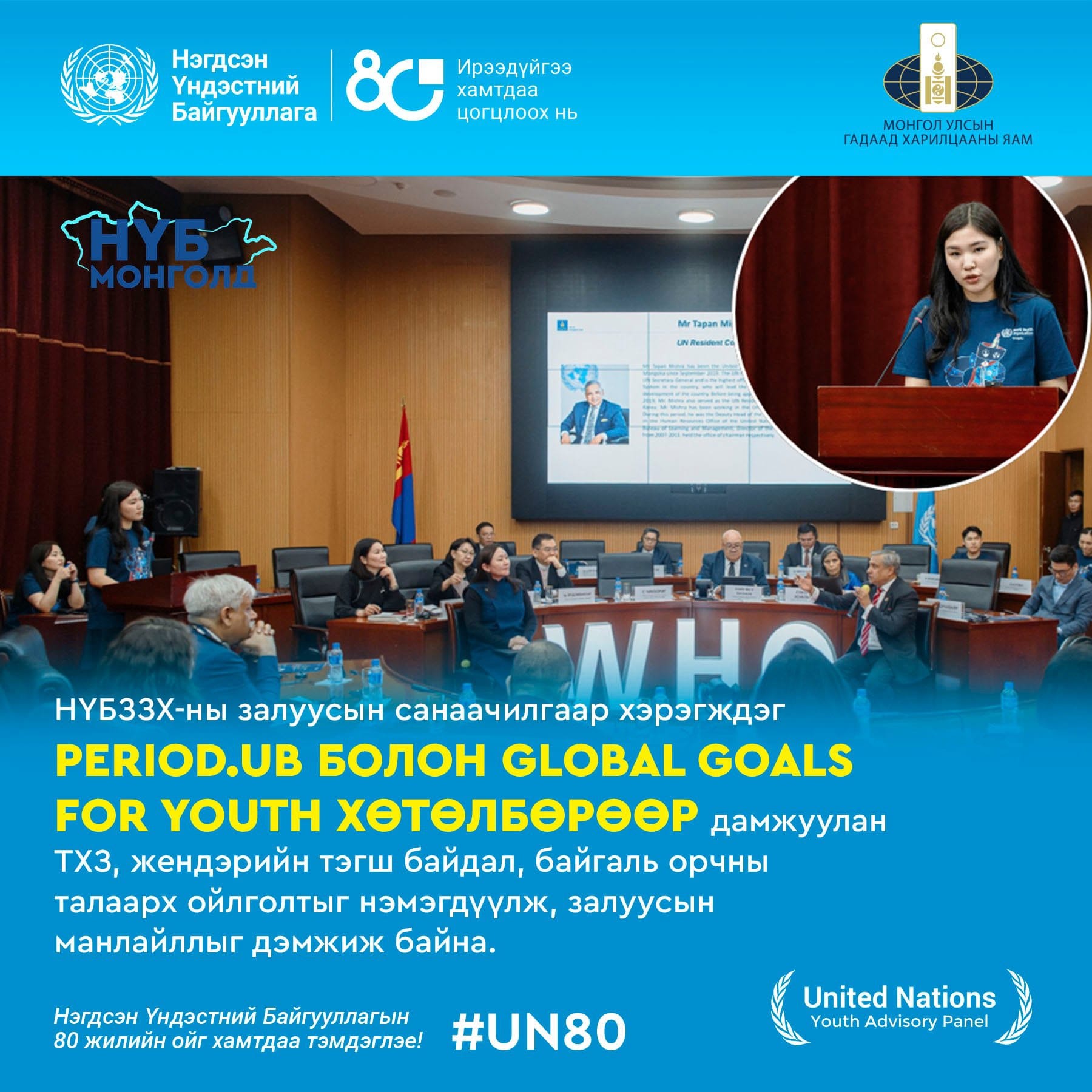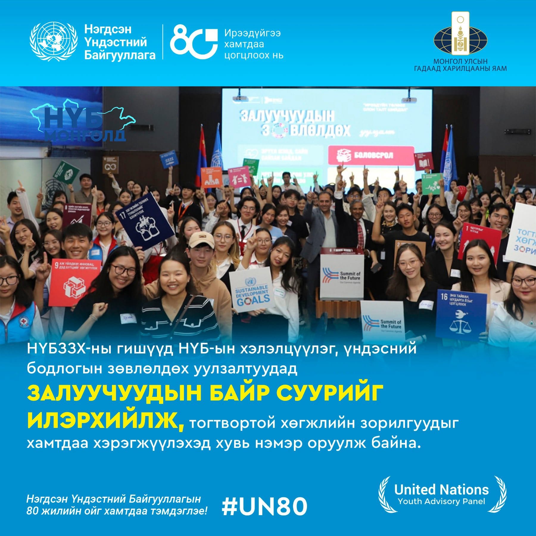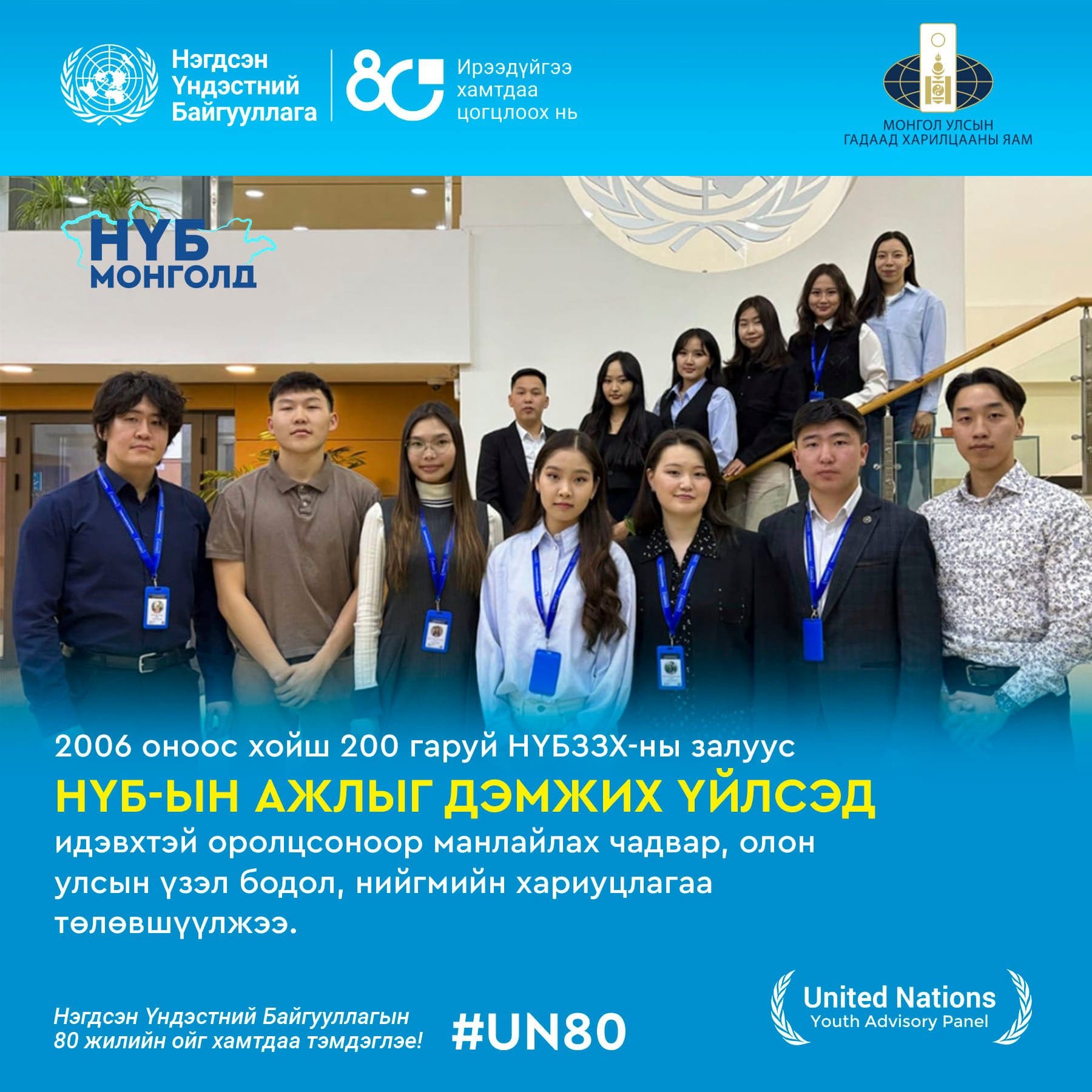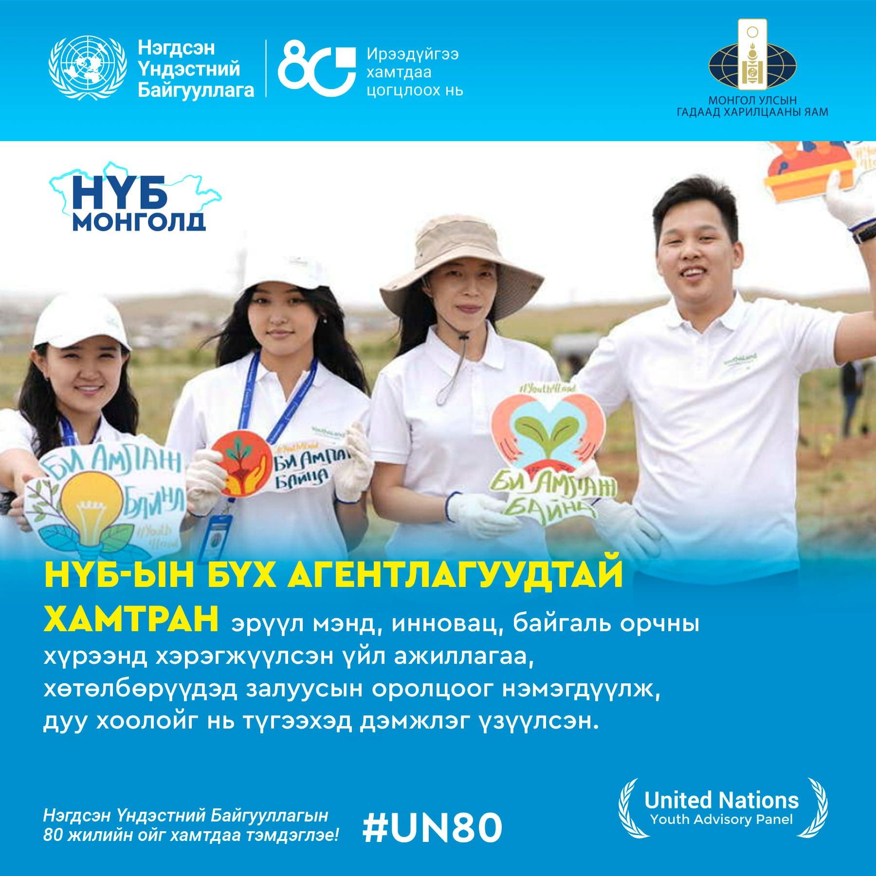 Нэгдсэн Үндэстний Байгууллагын 80 жилийн ойг тохиолдуулан Монгол Улсын Гадаад харилцааны яамтай хамтран хэрэгжүүлж буй “НҮБ 80” аяны хүрээнд НҮБ-аас Монгол Улсад хэрэгжүүлсэн онцлох ажлуудыг олон нийтэд цувралаар хүргэж байгаа бөгөөд Онцлох сэдвээр НҮБ-ын агентлагуудын залуучуудын оролцоог дэмжиж, тэдний дуу хоолойг НҮБ-ын үйл ажиллагаанд хүргэн ажиллаж байдаг НҮБ-ын Залуучуудын Зөвлөх Хороо (UNYAP)-ны үйл ажиллагааг онцлог тэмдэглэлээ.